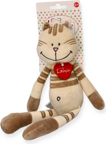 Deze zachte pluchen kat in een aangename beige kleur met bruine strepen charmeert kinderen met haar vriendelijke uitstraling en lange ledematen die heerlijk om te armen zijn. Dankzij het lichte ontwerp is ze gemakkelijk vast te houden, zelfs voor de allerkleinste handjes, en wordt ze een geliefde metgezel bij het slapen en spelen.
