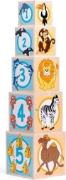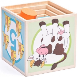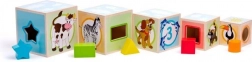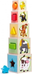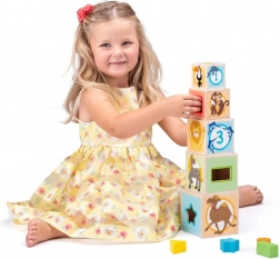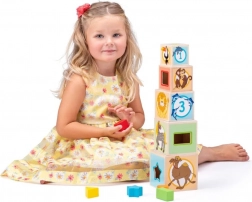 De houten toren met bekers en vormensorteerder combineert hoog stapelen met het oefenen van het plaatsen van de juiste vormen in de bijbehorende openingen. Kinderen ontwikkelen hun oog-handcoördinatie, leren kleuren, cijfers en dieren kennen en genieten tegelijkertijd van veel creatief spel.
