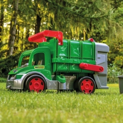 De WADER GIGANT FARMER vuilniswagen biedt kinderen een realistisch spel rond het schoonhouden van de stad. Dankzij de bewegende hefarm wordt de meegeleverde container eenvoudig geleegd, de openende achterklep vergemakkelijkt laden en lossen en de vrijlopende wielen zorgen voor een soepele rit. Het draagvermogen tot 50 kg maakt dat kinderen op de wagen kunnen gaan zitten en zich aan de praktische bovengreep kunnen vasthouden, terwijl de voorste trekhaak slepen of koppelen met een ander voertuig of een touw mogelijk maakt.
