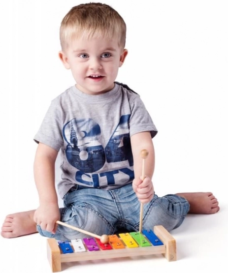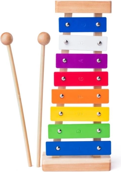 Het instrument bevat acht metalen toetsen in verschillende kleuren op een houten basis. Voorzien van twee houten stokken, is dit product afgestemd op kinderen vanaf drie jaar die met zijn hulp wederzijds plezier kunnen beleven en nieuwe vaardigheden kunnen leren.