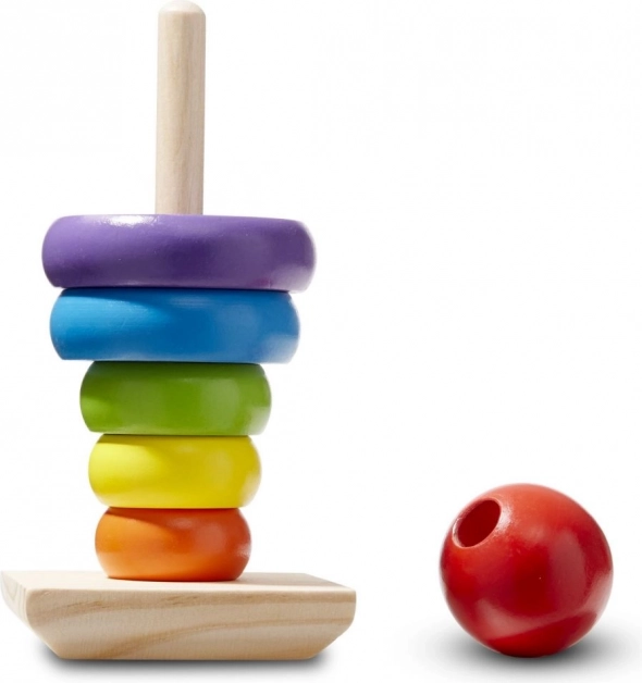 De constructie is gemaakt van hoogwaardig hout, wat zorgt voor duurzaamheid en een lange levensduur. Kinderen zullen houden van de heldere kleuren en het eenvoudige concept van ringen stapelen op een staaf.