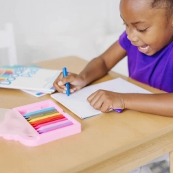 De set is ideaal voor opvang, school en thuis. Dankzij de praktische verpakking is het een perfecte reisgenoot – niets rolt van de tafel en alles blijft overzichtelijk geordend. Kwalitatieve wasco’s brengen gemakkelijk kleur aan, hebben diepe, verzadigde kleuren en zijn ontworpen voor kleine kinderhanden.