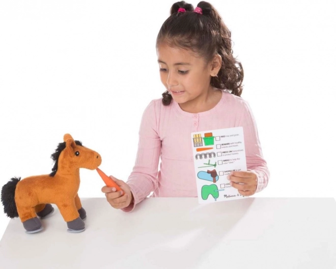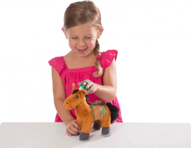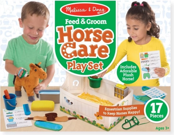 Deze verzorgingsset met een zacht pluchen paardje is het ideale speelgoed voor kleine paardenliefhebbers. Inclusief accessoires zoals een borstel, spons, wortel en voederbak, die realistisch boerderijspel en het leren verzorgen van dieren ondersteunen. Dankzij de vrolijke kleuren en de prettige materialen zullen kinderen er dol op zijn.