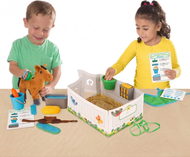 Het speelgoed stimuleert de ontwikkeling van empathie, rollenspel en fantasie. Kinderen kunnen het paardje borstelen, voeren en in het kleine stalletje leggen, waarbij ze eenvoudige taakkaartjes volgen. De set is geschikt voor kinderen vanaf 3 jaar en voldoet aan de CE-normen.