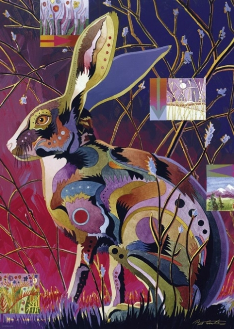 Deze designpuzzel brengt een opvallende, decoratieve compositie van kunstenaar Bob Coonts, die in de Rocky Mountains woont en bekendstaat om zijn kleurrijke stijl die de schoonheid van dieren vastlegt. Het konijnenmotief zal zowel natuurliefhebbers als verzamelaars van originele illustraties bekoren.
