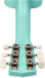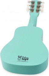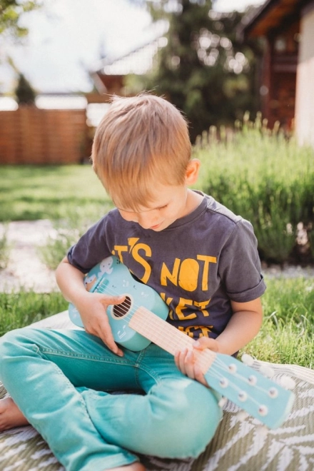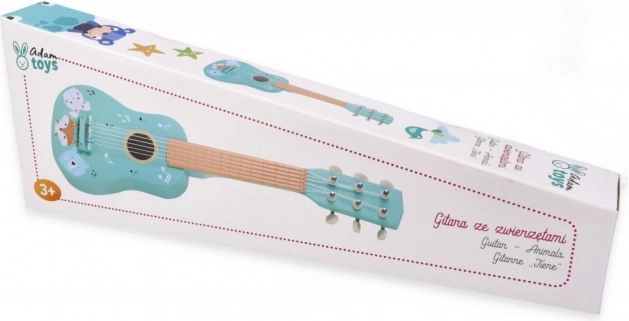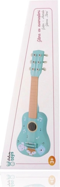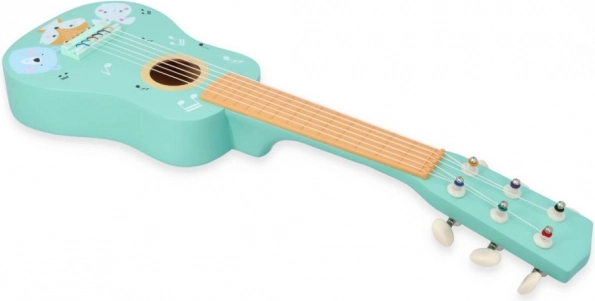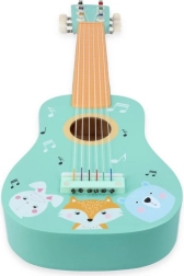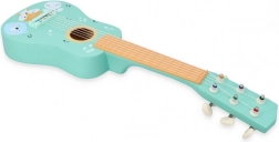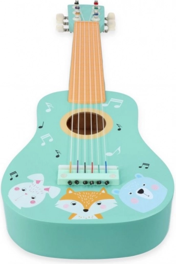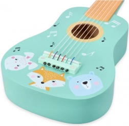 Schattige houten kindergitaar in turquoise met dierenillustraties die kleine muzikanten motiveert om de wereld van muziek te ontdekken. Biedt een duurzame houten constructie, echte snaren en makkelijk houvast, ideaal voor de eerste muzikale probeersels en de ontwikkeling van ritmegevoel en creativiteit.