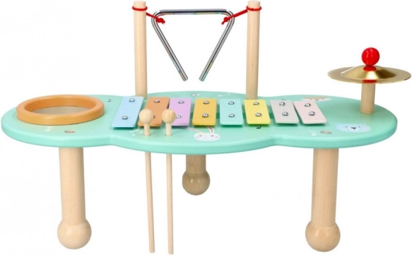 Alle favoriete percussie-instrumenten op één plek: xylofoon, triangel en bekken op een stevige houten constructie met een geïllustreerd blad en poten voor veilig spelen.