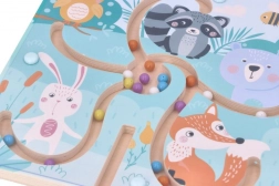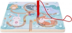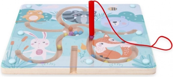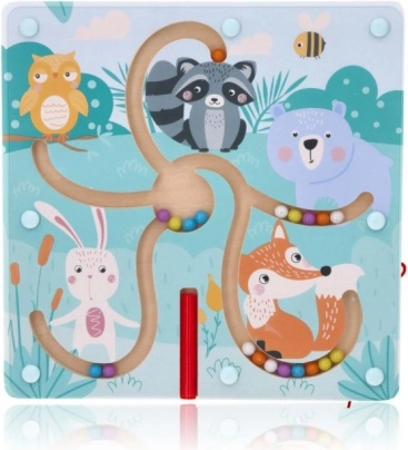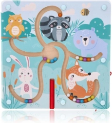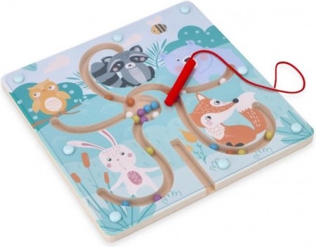 Het houten magnetische doolhof met bosdieren motiveert kleine ontdekkers vanaf 2 jaar. Met behulp van een magnetisch stokje bewegen kinderen de gekleurde kogeltjes over de paadjes en trainen ze fijne motoriek, oog-handcoördinatie en logisch denken. De kogeltjes worden beschermd door een transparante afdekking, het stokje zit aan een koordje en de compacte afmetingen van 22,5 × 22,5 cm maken het een ideale reisspeelgoed. Certificering CE.
