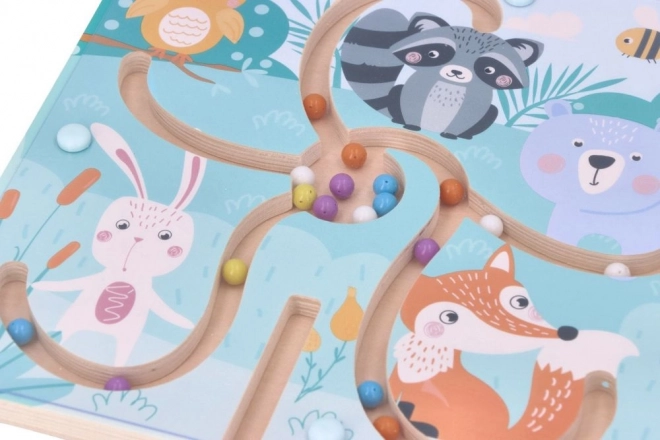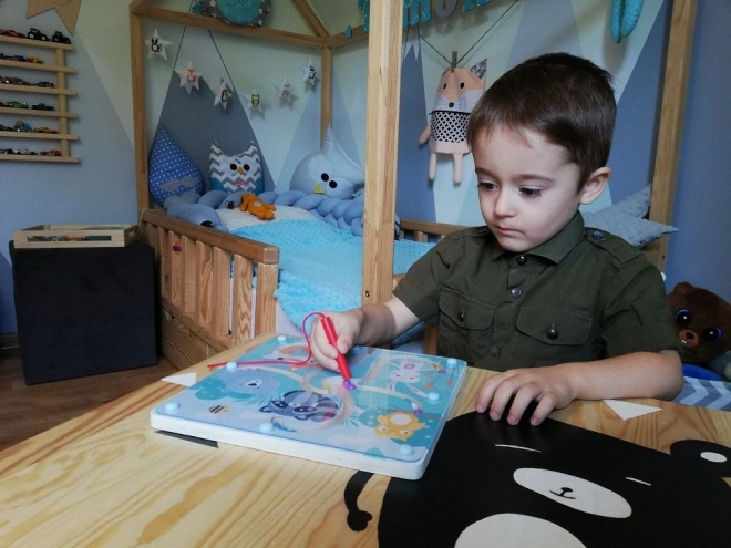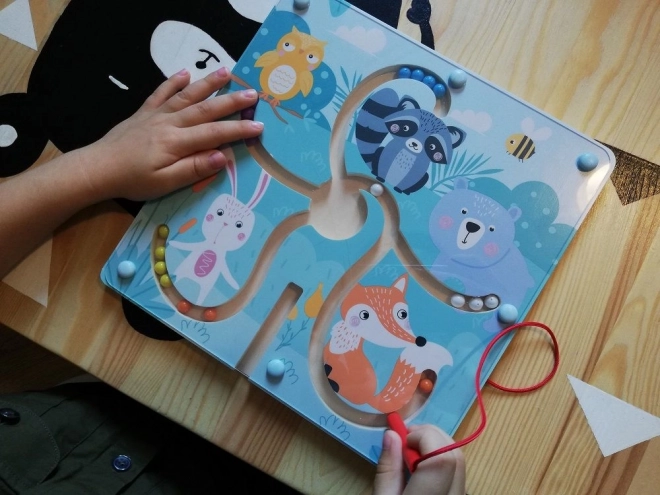 Het vrolijke magnetische doolhof met bosdieren verandert leren in een spel. Met het magnetische stokje leidt het kind de kogeltjes door kronkelende paadjes, koppelt het kleuren en traint het concentratie en precisie. Dankzij de gesloten uitvoering raken de kogeltjes niet kwijt en is het spelen veilig, zowel thuis als onderweg.