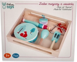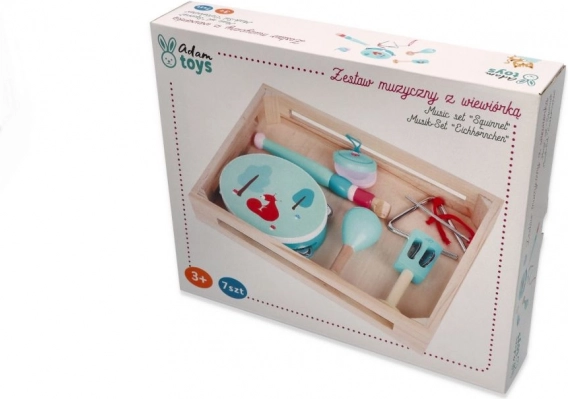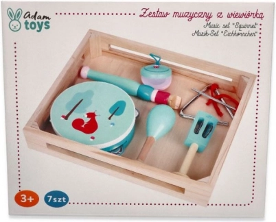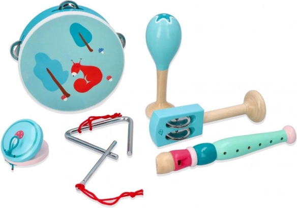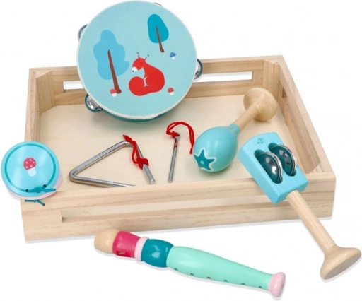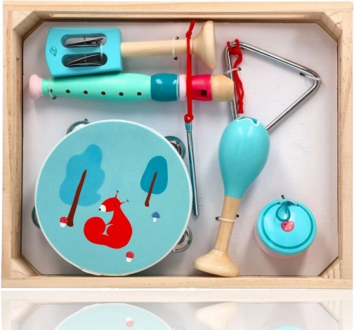 In de set vind je een tamboerijn met vier belletjes en een lieve eekhoorn, een mintkleurige fluit, maracas met bloemenmotief, castagnetten met paddenstoel, handbelletjes met blaadje, een metalen triangel met stokje en alles is opgeborgen in een praktisch houten dienblad/doosje voor eenvoudig opbergen en meenemen. Geweldig voor thuis musiceren, voor kleuterscholen en naschoolse opvang.
