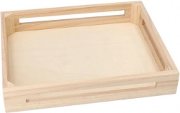 Alle onderdelen van de set zijn netjes opgeborgen in een houten dienblad met handgrepen – eenvoudig te dragen, alles op orde en veilig op te bergen, thuis en in de kleuterklas.