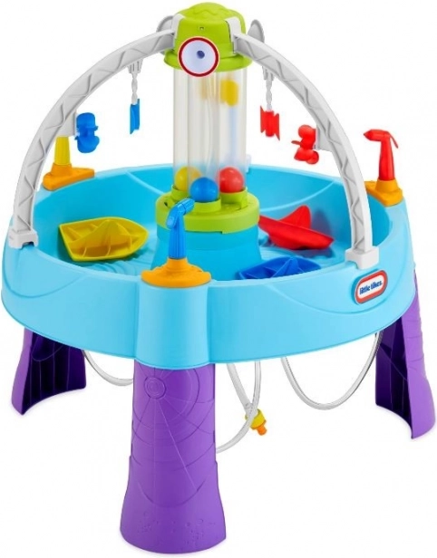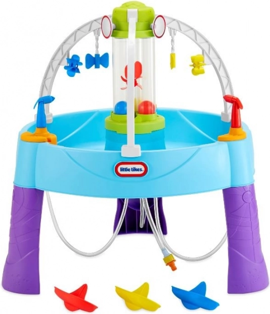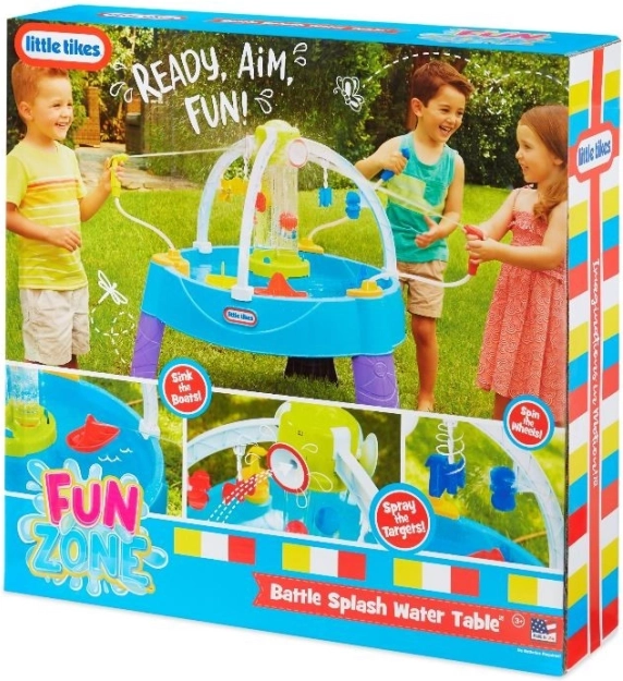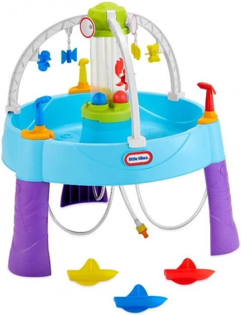 De watertafel biedt eindeloos plezier tijdens warme zomerdagen. Kinderen kunnen op doelen mikken, cilinders met water vullen of de schepen van hun tegenstanders laten zinken.