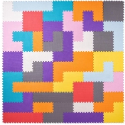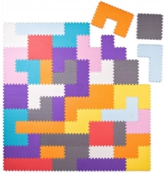 Verschillend gevormde stukjes zonder uitneembare onderdelen worden gelegd als TETRIS en maken een speelvlak tot 120 × 120 cm mogelijk. Vrolijke kleuren nodigen uit tot spel en leren.