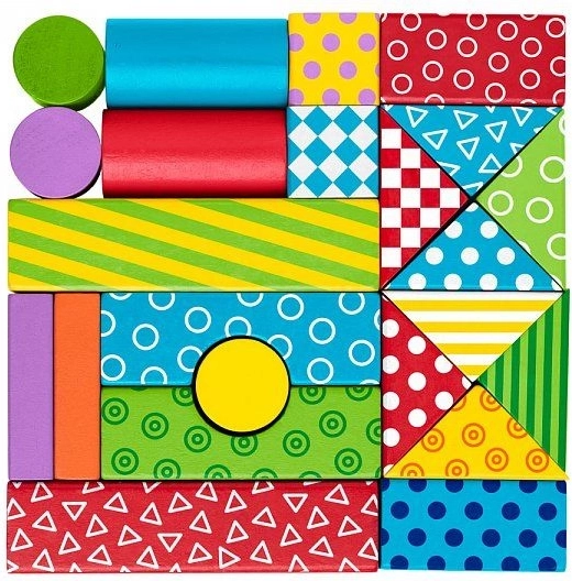 De set van 35 houten blokken in verschillende vormen, kleuren en patronen stimuleert de fantasie, fijne motoriek en het herkennen van vormen en kleuren.