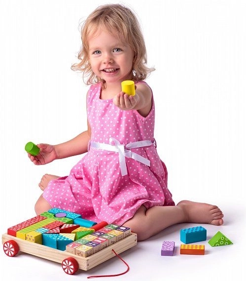 Het houten trekwagentje met 35 kleurrijke blokken maakt zowel kleine bouwers als nieuwsgierige ontdekkers blij. Kinderen kunnen het wagentje door de kamer trekken, torens bouwen en kleuren, vormen en letters leren herkennen. Het speelgoed bevordert oog-handcoördinatie, logisch denken en geduld, en is tegelijk veilig en duurzaam.