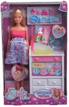 Zwangerschapspop Steffi tweeling Steffi verwacht 2 pasgeboren baby’s, inbegrepen is een kast met verschoontafel, met een mobiel, met een lade die open kan, 29 cm.