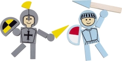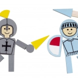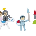 Gekleurde houten elementen met een glad oppervlak laten kinderen ridders, schilden, lansen en ledematen samenstellen – ideaal voor de ontwikkeling van motoriek en verbeeldingskracht.