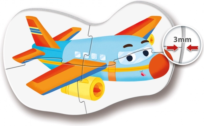 Eerste puzzelset voor de allerkleinsten met thema’s van vervoersmiddelen biedt vier puzzels met 2, 3, 4 en 5 stukjes. Grote stukjes van 3 mm zijn makkelijk vast te pakken en ondersteunen de fijne motoriek, oog-handcoördinatie en ruimtelijk inzicht. Ideaal vanaf 2 jaar.