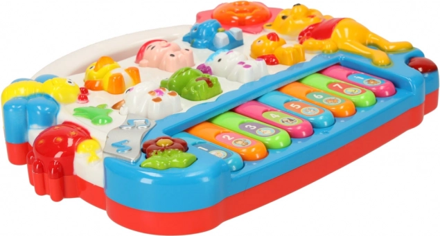 De schattige piano met vrolijke diertjes trekt de aandacht van kinderen vanaf de eerste momenten. Afhankelijk van de gekozen modus speelt hij de toonladder, melodieën of dierengeluiden af. Wanneer je de toetsen indrukt, licht het zonnetje op, wat kinderen motiveert tot verdere interactie en ontdekking.