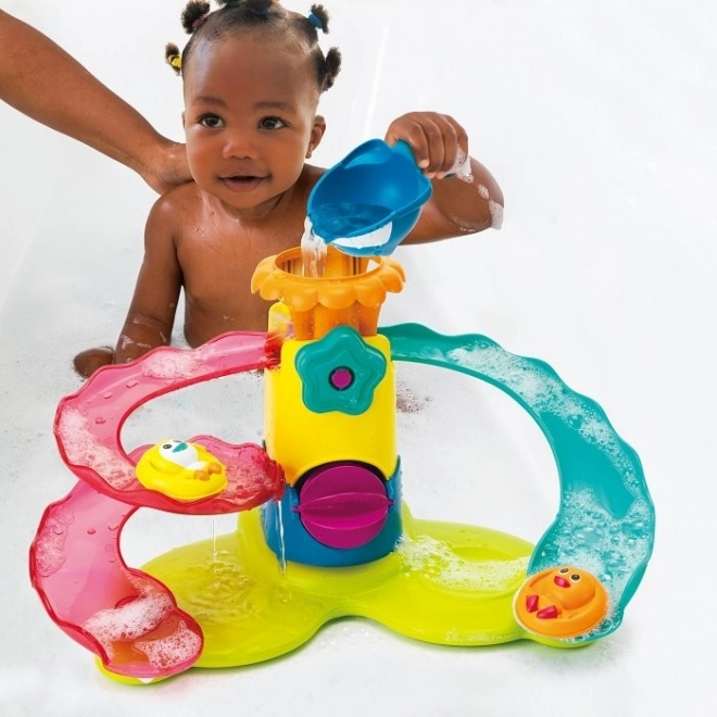 Verander een gewoon bad in een avontuur met ons kleurrijke kunststof aquapark! Dit speelgoed biedt twee spiraalvormige waterglijbanen verbonden met een centrale toren met een blauwe bloemenknop en een octopus bovenop, wat sensatie en fantasierijk spel stimuleert. Kinderen zullen urenlang plezier beleven in de badkamer met dit speelgoed dat beweging en kleurstimulatie bevordert. Inclusief twee diertjes op pontons en een walvisschep voor het gieten van water.