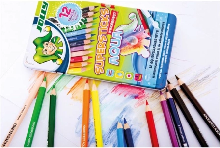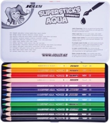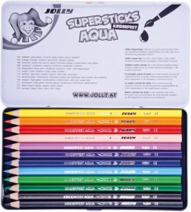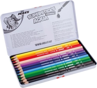 Ontdek creatieve mogelijkheden met de aquarelkleurpotloden JOLLY Supersticks Aqua. Gebruik ze droog voor dekkende kleuren of voeg water toe en verander streken in zachte aquarelschilderingen. De metalen doos beschermt de potloden thuis en onderweg en houdt ze overzichtelijk geordend.
