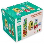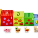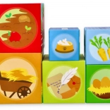 Deze kleurrijke set stapelblokken met boerderijthema biedt kinderen eindeloze speelmogelijkheden: van het bouwen van een hoge toren tot insteken en sorteren, en het ontdekken van cijfers, vruchten en schattige dieren. Elk blok is zo geïllustreerd dat het visuele waarneming, herkennen van vormen en hoeveelheden en eerste telvaardigheden stimuleert.