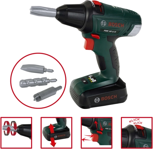 De hoofdrolspeler is de draadloze accu boor-/schroefmachine met geluid, lichteffect en een draaiende schroef, die het werken met een echt gereedschap perfect simuleert. Inclusief 4 verwisselbare opzetstukken, een zaag met comfortabele greep, hamer, Franse sleutel (verstelbare moersleutel), 2 kunststof plaatjes met gaten, 4 schroeven en 2 spijkers – allemaal van duurzaam plastic.