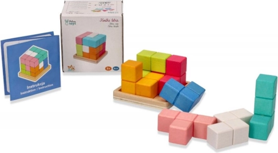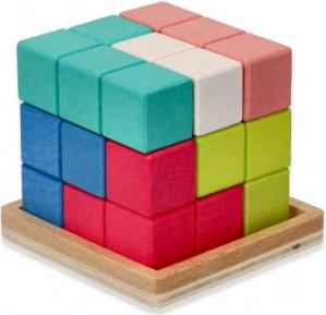 Het puzzelblok helpt kinderen hun fijne motoriek te ontwikkelen en verhoogt hun probleemoplossend vermogen. Met heldere kleuren zoals blauw, oranje, roze en natuurlijk hout is dit speelgoed niet alleen leuk maar ook leerzaam.
