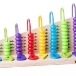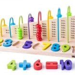 De set bevat een houten telraam en 13 verwijderbare gekleurde blokken in de vorm van cijfers en symbolen +, - en =.