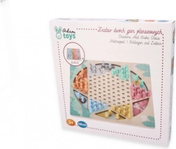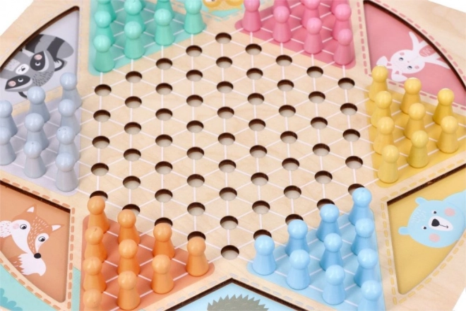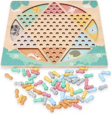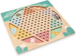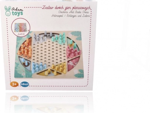 Het dubbelzijdige houten bord met een afmeting van circa 30 × 30 cm is versierd met subtiele dierenmotieven en aangevuld met kleurrijke, gemakkelijk vast te pakken speelstukken. Dankzij de stevige uitvoering en overzichtelijke vormgeving is het ideaal voor samen spelen door kinderen en volwassenen.