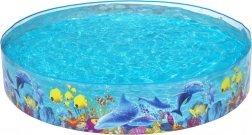 Het grote ronde opzetzwembad van BESTWAY is ideaal voor in de tuin of bij de bungalow. De constructie stabiliseert zichzelf na het vullen, de stevige PVC-wanden zijn bestand tegen dagelijks gebruik en de zeegrafiek met dolfijnen en visjes spreekt kinderen meteen aan. Het zwembad is gemakkelijk schoon te maken, op te vouwen en op te bergen voor het volgende seizoen.