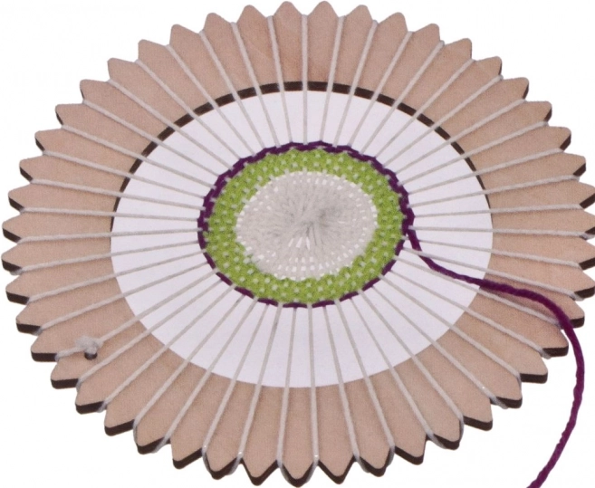 De cirkelvormige houten frames met getande rand houden de schering stabiel, zodat patronen precies worden en het werken comfortabel is, ook voor beginners.