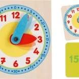 Een leuk en praktisch leersetje waarmee kinderen gemakkelijk uren, minuten leren herkennen en voormiddag/namiddag én analoge en digitale tijd leren onderscheiden. Een klok met verschuifbare wijzers op het deksel van het doosje en 12 dubbelzijdige houten kaartjes ondersteunen spelenderwijs leren en de ontwikkeling van logisch denken. Gemaakt van hoogwaardig hout met ongevaarlijke verven.
