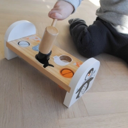 Het inslaan van gekleurde pinnen met het houten hamertje versterkt de greep, precisie en oog-handcoördinatie – sleutelvaardigheden voor de vroege ontwikkeling.