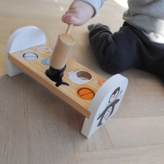 Schattige houten hamertafel met pinguïn-motief, ideaal speelgoed voor kinderen vanaf 1 jaar. Gekleurde pinnen en een houten hamertje stimuleren de fijne motoriek, oog-handcoördinatie en concentratie. Hoogwaardige afwerking van natuurlijk hout en een speels design zorgen elke dag voor veilig en leuk spel.