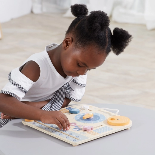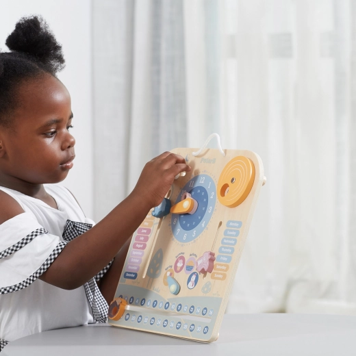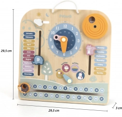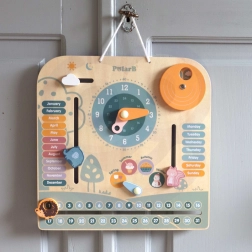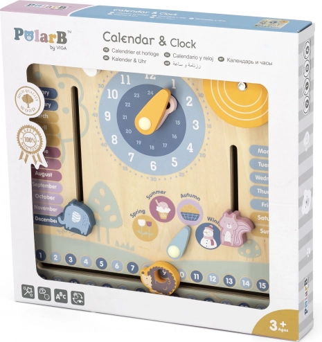 Houten kalender en klok PolarB Montessori is een perfecte combinatie van spel en leren. Het helpt kinderen tijd en dagen van de week te herkennen en de seizoenen en het weer te leren met behulp van interactieve elementen.