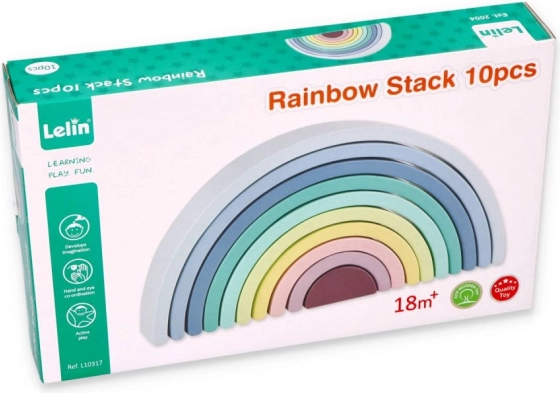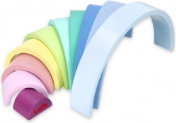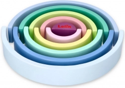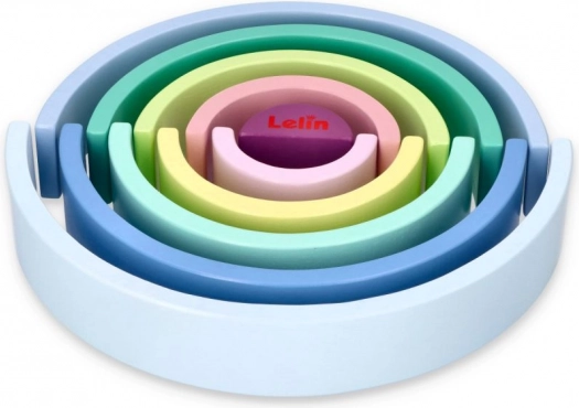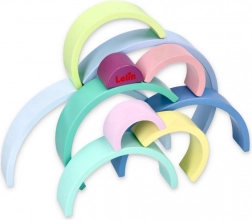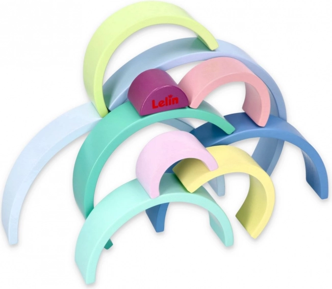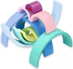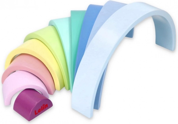 Houten bogen in pastelkleuren zoals blauw, groen en roze bevorderen kleurherkenning en creatief spel.