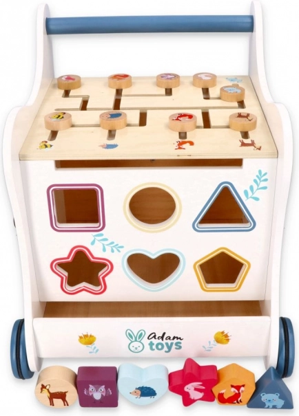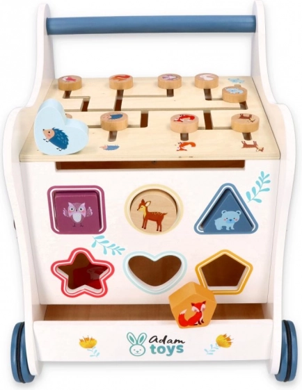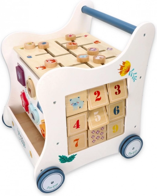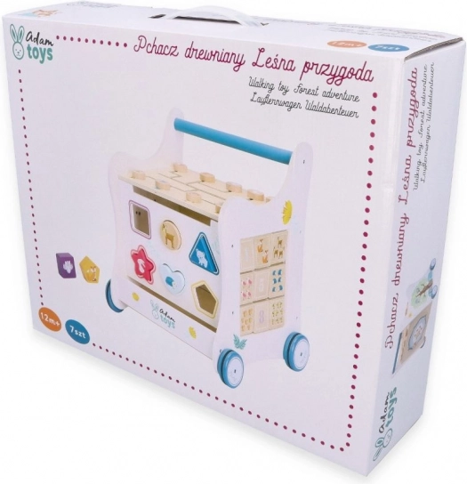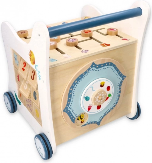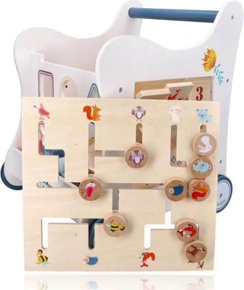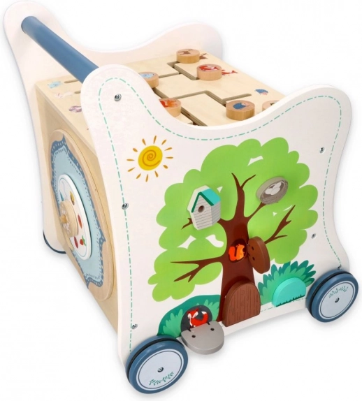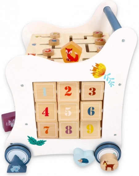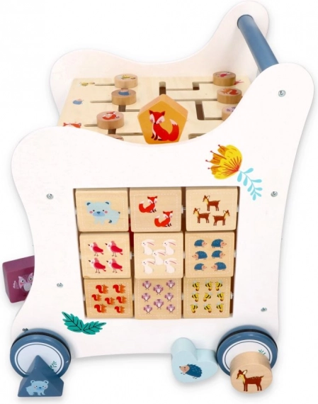 Deze houten duwloopwagen voert je kind mee in de wereld van kleuren, vormen en bosdieren. Het voorpaneel biedt een leuke vormenstoof die de fijne motoriek, oog-handcoördinatie en het logisch denken stimuleert. Bovenop wacht een doolhof met schuifkralen dat geduld, planning en ruimtelijk inzicht bevordert. Zijdelingse illustraties met dieren inspireren tot het ontdekken van de natuur en het verzinnen van eigen verhaaltjes.
