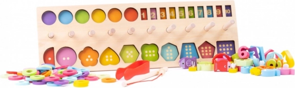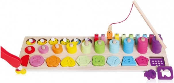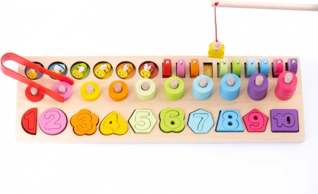 Deze multifunctionele houten speelgoedset is ideaal voor de eerste stappen in de wereld van tellen en vormen. Kinderen oefenen spelenderwijs het onderscheiden van kleuren, het koppelen van cijfers 1–10, het rijgen van ringen en het vangen van onderdelen met de magnetische hengel. Er zijn ook plastic pincetten inbegrepen om de moeilijkheidsgraad te verhogen en de greep te trainen.