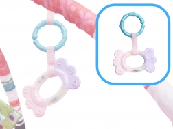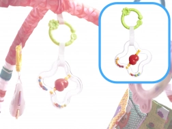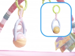 - Mat met speeltjes aan de bogen: Kleurrijke speeltjes trekken de aandacht van de baby en motiveren tot het versterken van nek-, arm- en beenspieren.