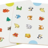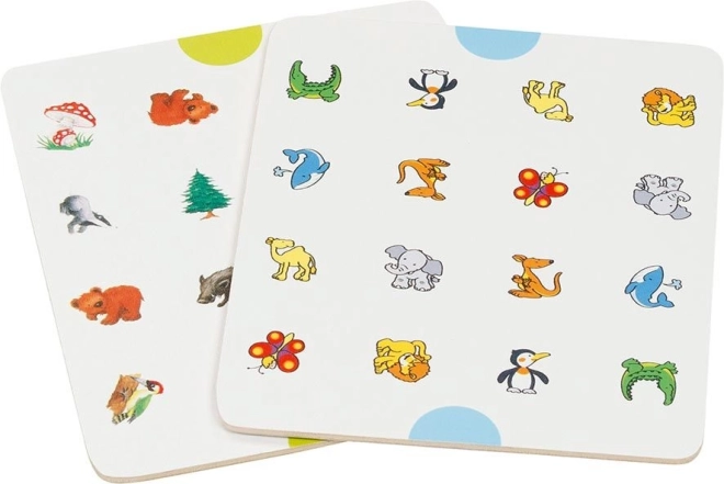 Het houten memory Dieren en symbolen tilt je memoryspel naar een hoger niveau. Spelers plaatsen kartonnen kaartjes met afbeeldingen in het basisbord van hout en bedekken ze met blauwe stenen. Het spel verloopt zoals klassiek memory, maar degene die de meeste blauwe stenen verzamelt, wint.