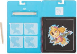 De spiraalgebonden blocnote met zwarte pagina’s onthult na het krassen levendige kleuren en Paw Patrol-motieven. Ideaal voor de eerste tekenexperimenten.