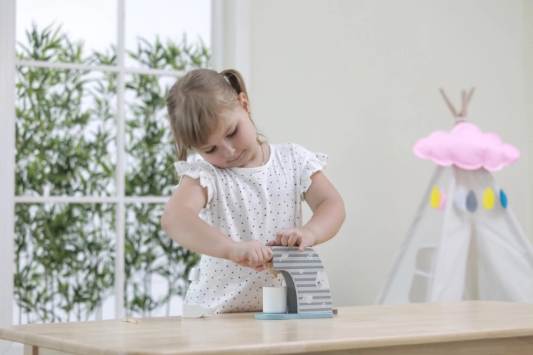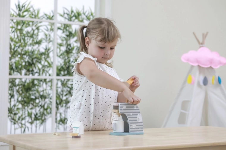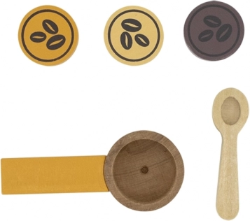 Stijlvolle houten koffiemachine voor kinderen vanaf 3 jaar brengt realistische koffiebereiding in elke kinderkitchen. Dankzij de draaiknop, portafilter en meegeleverde accessoires (kopje, lepeltje, capsules en “melk”) ontwikkelen kinderen hun fijne motoriek, verbeeldingskracht en rollenspel. Compacte afmetingen en hoogwaardig gelakt hout zorgen elke dag voor veilig en duurzaam spel.