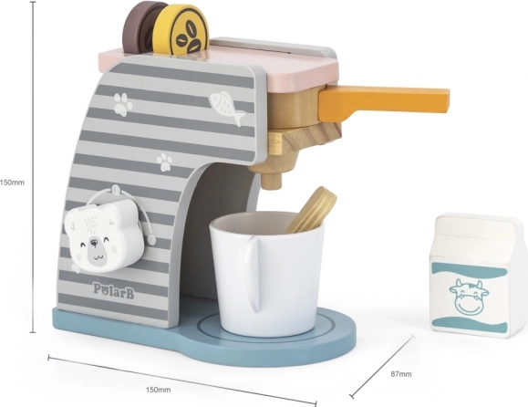 Deze houten koffiemachine voor kinderen in zachte kleuren met schattige motieven is ontworpen voor kleine barista’s. Draaielementen en het hefboomsysteem bootsen een echte koffiemachine na, zodat kinderen een “espresso” kunnen “zetten”, “melk” toevoegen en roeren met het lepeltje in het witte kopje.