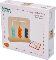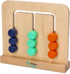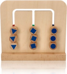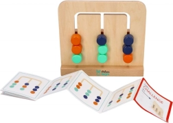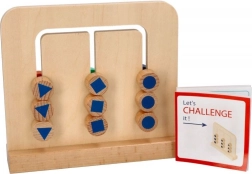 De set bevat een houten puzzel met 9 blokken in 3 kleuren of 3 patronen op de andere zijde en een dubbelzijdige brochure met kaartkaarten. Het plezier bestaat erin de blokken zo te herschikken dat ze het door jou gekozen patroon vormen.