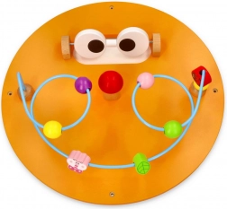 Het hoofd van de rups heeft een metalen lus met houten kralen die kinderen door het labyrint kunnen schuiven.