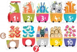 Ontdek een leuke educatieve puzzel met een lange trein en zijn passagiers. De set bevat 30 stukken, waarvan 10 uitneembare schijfjes met cijfers die in de juiste openingen passen. Ideaal voor kinderen vanaf 3 jaar – ontwikkelt de fijne motoriek, logica en het leren tellen tot 10 via creatief spel met grote en stevige stukken.