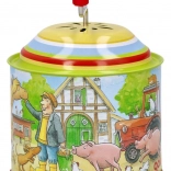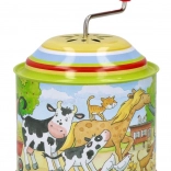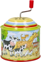 De speeldoos is versierd met een kleurrijke illustratie van een boerderij met figuren zoals koeien, paarden, katten en kippen.