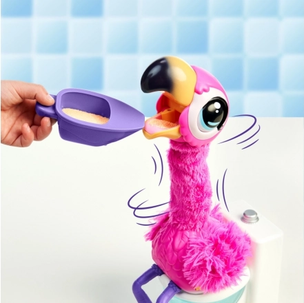 De leuke interactieve flamingo Little Live Pets zal kinderen verrassen doordat hij zich laat voeren met speciaal Aqua-zand, zingt, danst, praat en na het eten naar het toilet gaat. Hij kondigt het aan met de Engelse zin “Uh, oh, I gotta go”, herhaalt de woorden van zijn eigenaar en dankzij het herbruikbare zand zorgt hij keer op keer voor plezier.