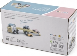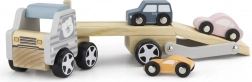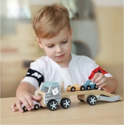 De tweeledige aanhanger met kantelbare oprit ondersteunt realistisch spel en het leren van sequenties – kinderen laden en lossen de autootjes zelf.